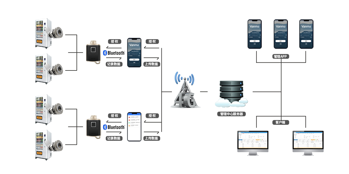 自動售貨機鎖控管理系統由智能無源電子鎖、智能指紋藍牙鑰匙、手機APP、主站管理軟件四部分組成。智能無源電子鎖完成機械動作及數據存儲;智能指紋藍牙鑰匙實現人員識別、給鎖供電及數據傳輸;手機APP與智能指紋藍牙鑰匙通訊,實現遠程授權操作及數據遠程上傳。